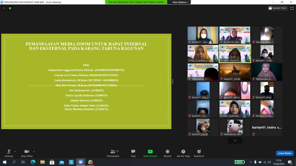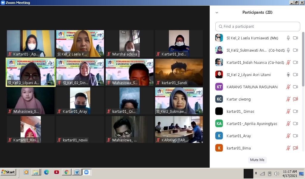 Jakarta – Pada tanggal 17 April 2021 hari sabtu pukul 10.00 WIB, dosen-dosen Universitas Nusa Mandiri mengadakan Workshop Online menggunakan media aplikasi Zoom Meeting untuk para anggota Karang Taruna Ragunan Jakarta Selatan.