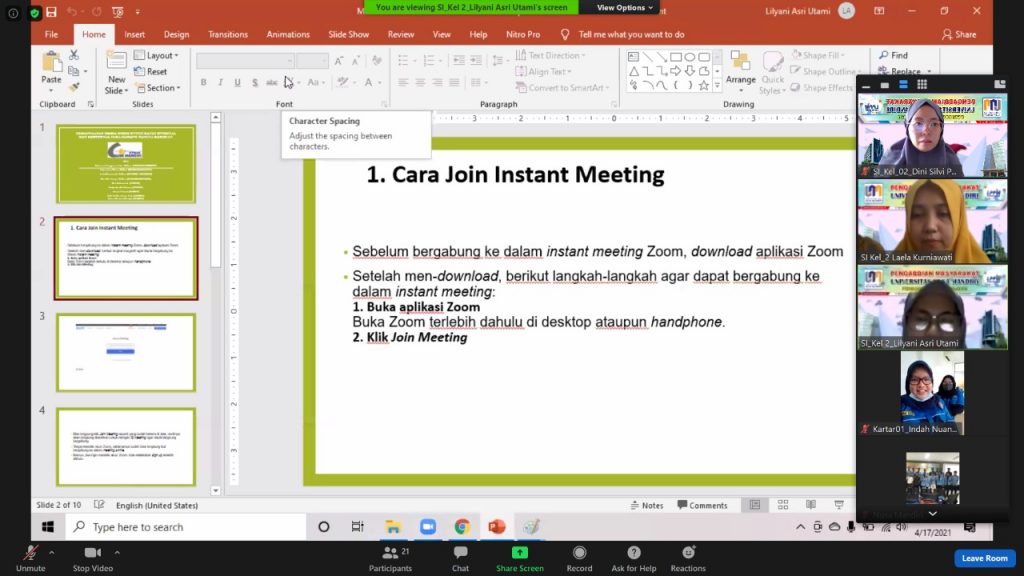 Workshop yang dilaksanakan secara online ini bertemakan “Pemanfaatan Media Zoom untuk Rapat Internal dan Eksternal pada Karang Taruna Ragunan” dan diikuti oleh kurang lebih 15 peserta karang taruna ragunan. Pada workshop ini membahas mengenai bagaimana pemanfaatan aplikasi zoom pada kegiatan rapat, baik internal maupun eksternal dengan tujuan agar para peserta karang taruna dapat mengaplikasikan media zoom ini dalam setiap kegiatannya mengingat saat ini masih pandemik.