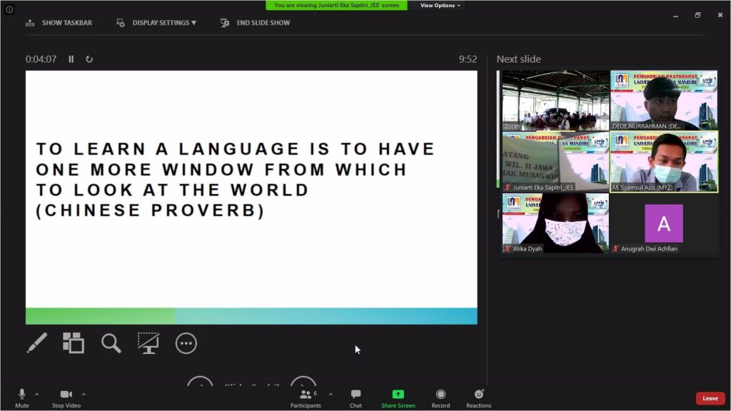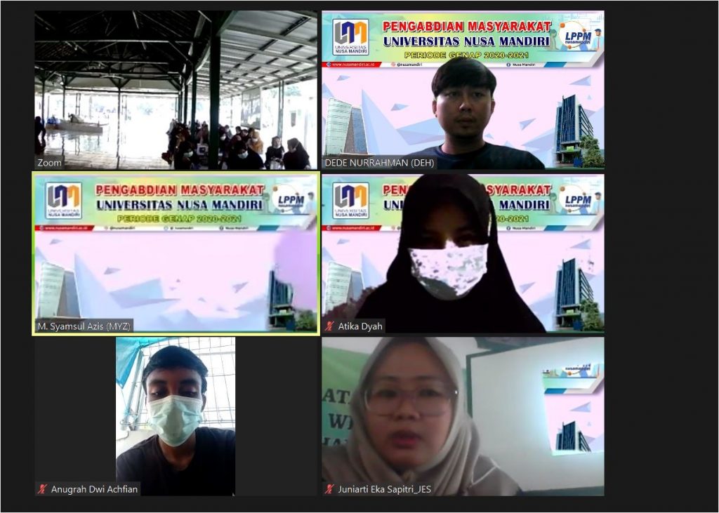Sabtu, 24 April 2021 Dosen Universitas Nusa Mandiri dalam rangka memenuhi Tridharma perguruan tinggi kembali menggelar agenda rutin semester yaitu pengabdian kepada masyarakat. Pelaksanaan pengabdian Masyarakat kali ini dilakukan secara daring dikarenakan masih dalam suasana social distancing pencegahan penyebaran Covid-19. Pelaksanaan pengabdian masyarakat dilakukan dengan memanfaatkan aplikasi Zoom Meeting.