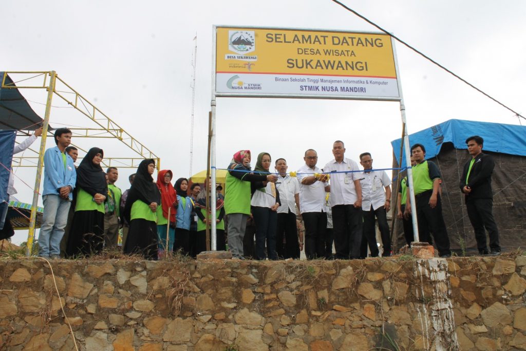 STMIK Nusa Mandiri menjadi salah satu dari 57 perguruan tinggi yang ada di Indonesia yang ikut berperan dalam pendampingan desa wisata. Desa Sukawangi yang terletak di kecamatan Sukamakmur kabupaten Bogor menjadi desa pilihan STMIK Nusa Mandiri. Desa sukawangi dipilih karena mempunyai daya tarik tersendiri diantaranya terdapat 2 curuq yang sangat berpotensi untuk dikembangkan menjadi objek wisata yang potensial yaitu curuq cibeet dan curuq arca yang saat ini sudah dikembangkan oleh karangtaruna yang ada di desa sukawangi. Selain dari pada 2 curuq tersebut ada juga taman sukawangi yang mempunyai objek wisata untuk tempat santai dan foto-foto dalam menikmati indahnya pemandangan dari atas desa sukawangi. Selain itu adanya permandian air panas cipanas yang di akui masyarakat setempat bisa mengobati berbagai penyakit kulit, Selain itu adanya wisata kebun kopi dan pengolahan kopi hasil bumi dari desa sukawangi.