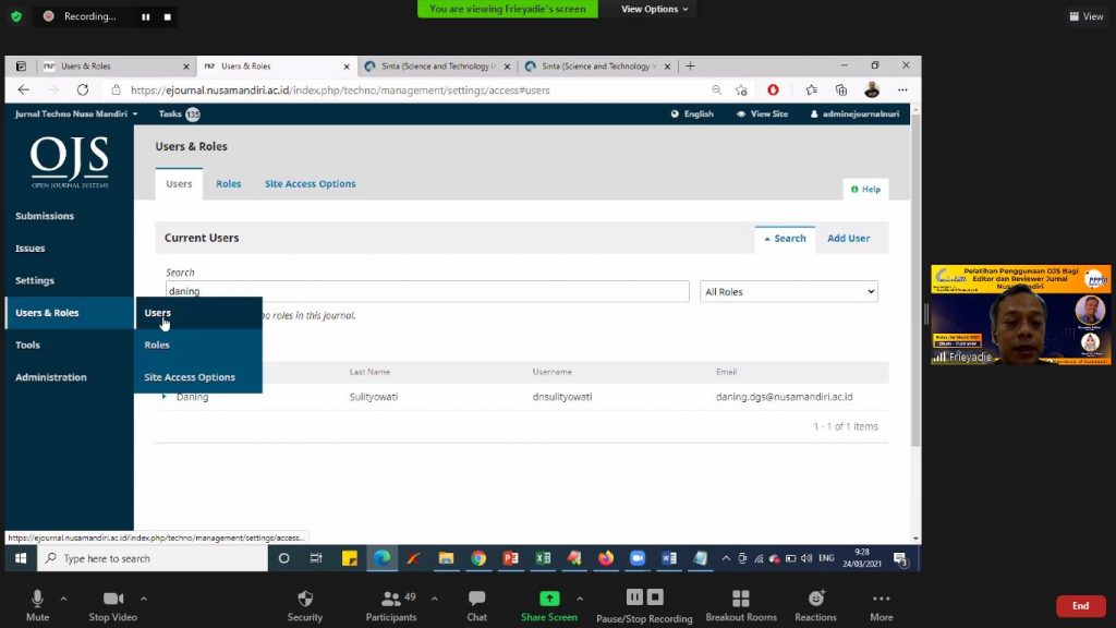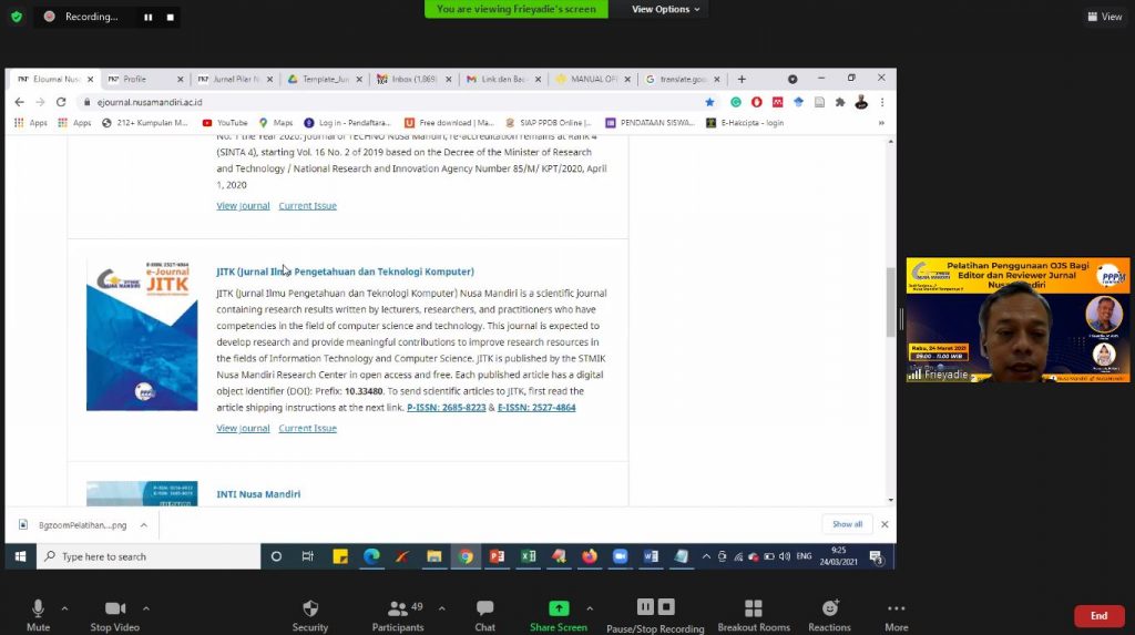 Selain menyampaikan prosedur penggunaan OJS yang baik dan benar, beliau juga menyampaikan perlunya pemahaman dan ketelitian tentang setiap jurnal Nusa Mandiri. Terdapat jenis-jenis jurnal Nusa Mandiri yaitu PILAR Nusa Mandiri, TECHNO Nusa Mandiri, JITK Nusa Mandiri dan INTI Nusa Mandiri serta AbdiMas Nusa Mandiri yang dapat diakses pada halaman: http://ejournal.nusamandiri.ac.id/index.php/.