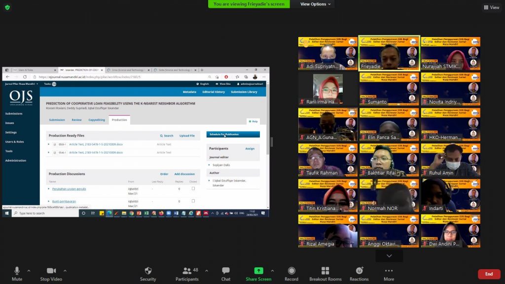Kegiatan terlaksana dengan baik dan lancar, antusiasme yang tinggi berupa banyaknya pertanyaan dari partisipan juga sangat dirasakan dalam sesi sharing dan diskusi dengan pemateri. Diharapkan kegiatan ini dapat mempermudah dan memberikan pemahaman tentang penggunaan OJS khususnya, serta dapat meningkatkan publikasi jurnal Nusa Mandiri yang berkualitas. Tidak lupa dilakukan juga sesi foto bersama diakhir kegiatan.