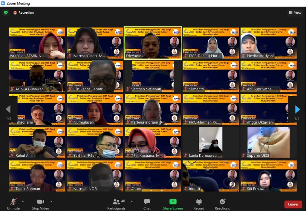 Kegiatan ini diikuti oleh 100 dosen yang berada dilingkungan STMIK Nusa Mandiri dan Universitas Bina Sarana Informatika (UBSI) secara virtual dikarenakan pandemi Covid-19 via aplikasi Zoom Meeting yang dilaksanakan pada hari Rabu, 24 Maret 2021 pukul 09.00 – 11.00 WIB dengan acara dibuka oleh Ibu Norma Yunita, M.Kom selaku ketua PPPM STMIK Nusa Mandiri untuk mengisi sambutan salam pembuka.